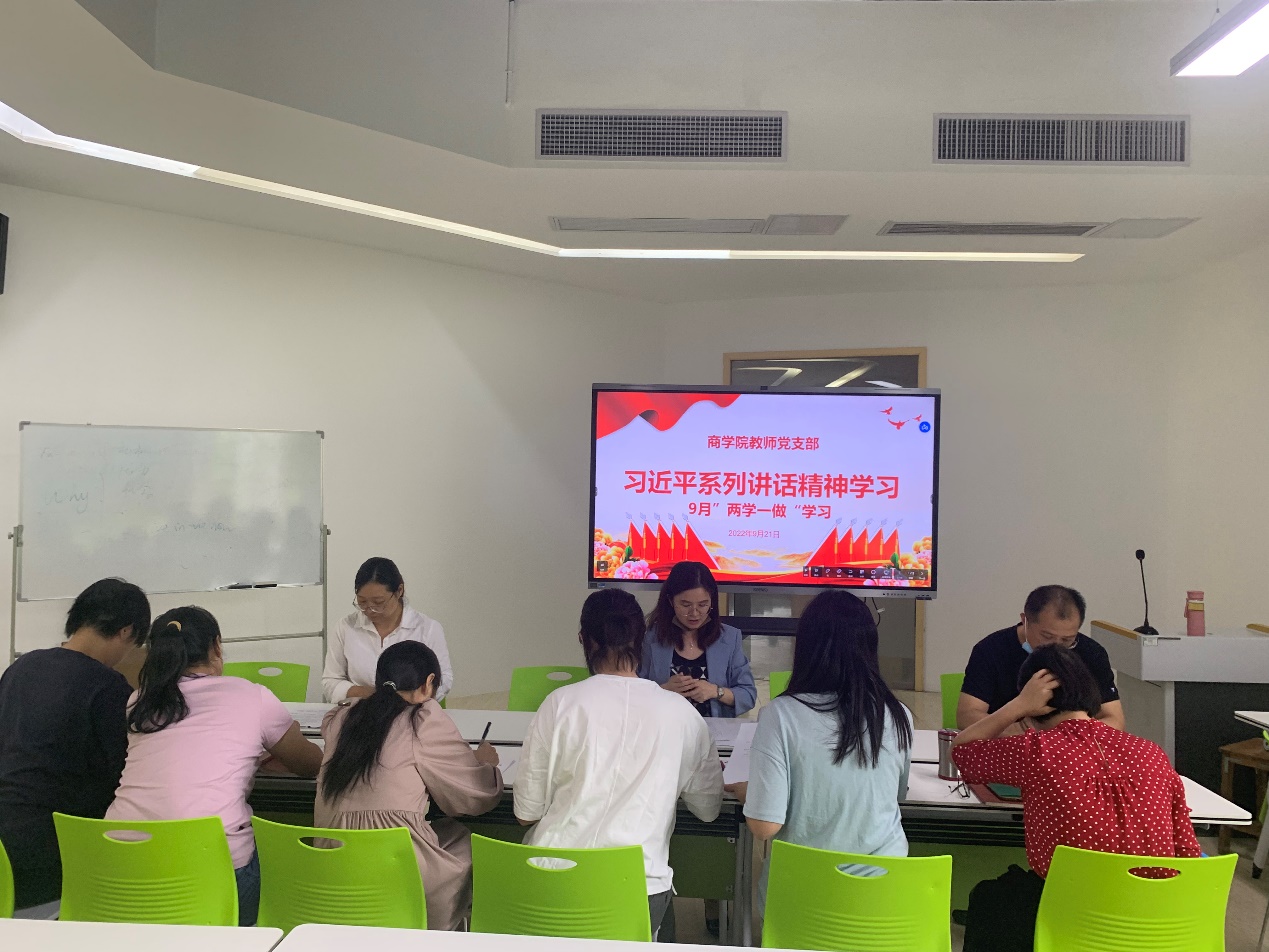 本网讯(通讯员 郭若艺) 9月21日下午,商学院教师党支部举行9月份“两学一做”理论学习会。学院党总支书记胡紫玲、副院长张亮和支部党员教师一起参加了学习会,会议由教师党支部书记郭若艺主持。