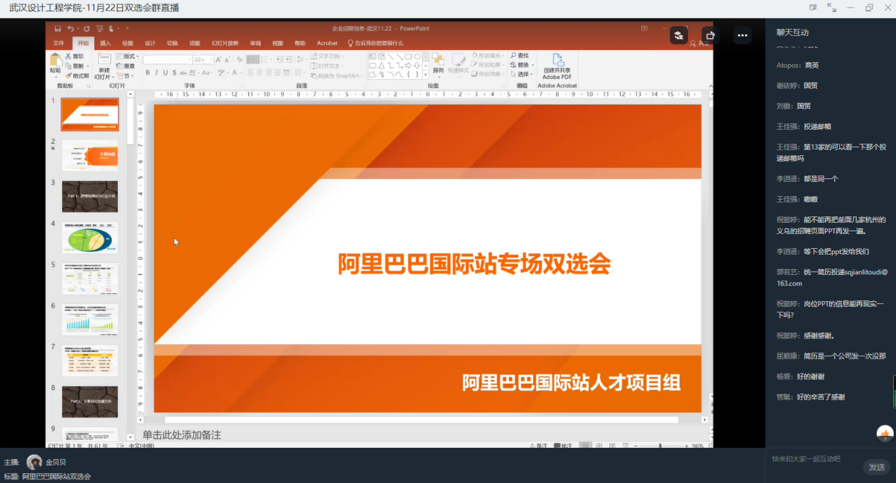 此次我校与阿里国际举行的线上校园专场双选会,是商学院经贸与管理系依托教育部第二期供需对接就业育人项目开展的校企合作成果之一。为适应疫情常态化背景下高校毕业生就业工作的新形势新要求,双选会采用企业钉钉群线上直播形式进行。