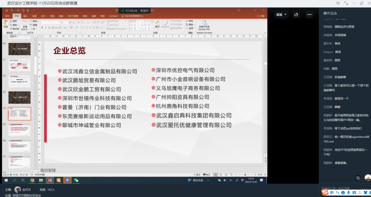 本次专场双选会阿里国际专门针对商学院学生就业意向和行业发展布局,共邀请审核筛选通过审核的企业14家,现场提供近百余个岗位。招聘企业主要分布在湖北武汉、山东聊城、浙江杭州和广东广州、东莞和深圳等地以外贸和跨境电商企业为主,推荐的用人单位偏向我院学生生源地较为集中地区,同时也是国内跨境电商行业发展前沿地。参会学生涵盖商学院国际经济与贸易、市场营销、商务英语和文化产业管理等四个专业毕业班,共计约140余名毕业生参加了钉钉线上直播宣讲和就业咨询。商学院党总支书记胡紫玲入会指导工作,线上访问用人单位,关心毕业生求职情况。商学院就业负责人廖翔老师在线上现场为毕业生提供简历诊断服务,让学生们投递出去的简历更具竞争力。