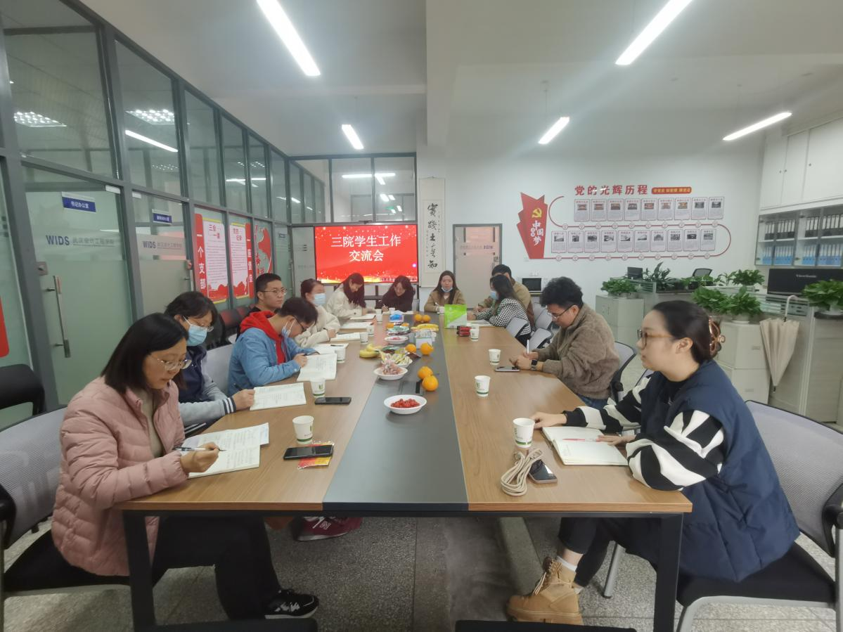 最后,三院达成共识,今后将加强沟通、优势互补,不断创新学生工作形式、丰富学生工作内容,促使三院学生工作更好地开展,以实际行动贯彻党的二十大精神,为学校学生工作走在前列做出三个学院的贡献。