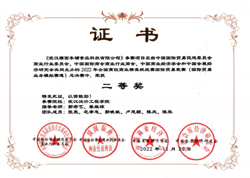 受疫情影响,2022年全国高校商业精英挑战赛国际贸易竞赛(国际贸易业务模拟赛道)首次在线上以2022年中国(宁波)跨国采购商品洽谈会暨2022年中国(宁波)品牌商品博览会形式完成全部流程。我校国贸专业六位学生---张亮、郭晓敏、范孝忠、卢思颖、陈庆、陈乐组成团队,以武汉樱面本铺食品科技有限公司为出口商代理人身份参赛,为企业提供品牌营销策划和海外推广方案。此次竞赛包括国际贸易业务知识竞赛、商业计划书(中文)、新产品发布会(英语或小语种)、展位海报设计与商品陈列、商贸配对贸易谈判(英语或小语种)五个环节,赛程从初夏到寒冬,历时半年。