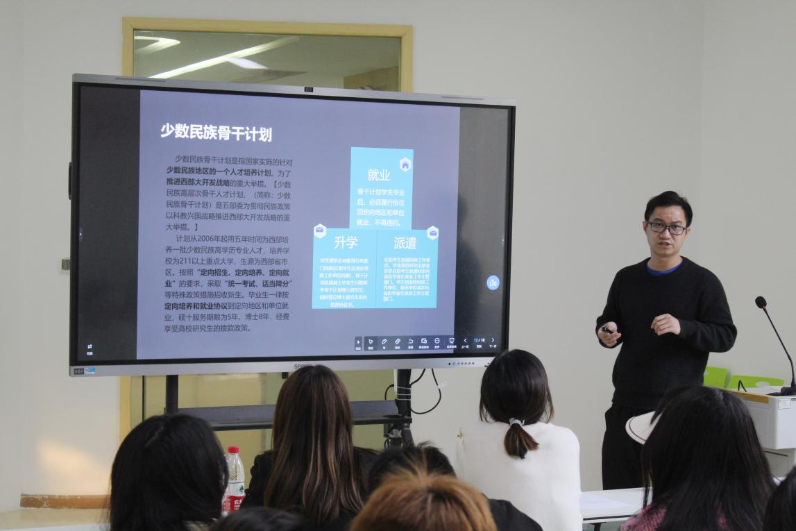 廖翔老师根据当前的就业形势,从知、信、行三个角度出发,对少数民族同学就业发展提供了建议参考。其中,着重讲解了“少数民族骨干计划”、“大学生志愿服务西部计划”、“三支一扶”等就业政策,最后分享了学院近年来优秀少数民族学生成功就业经验。