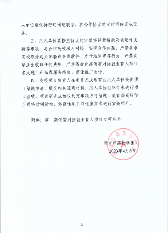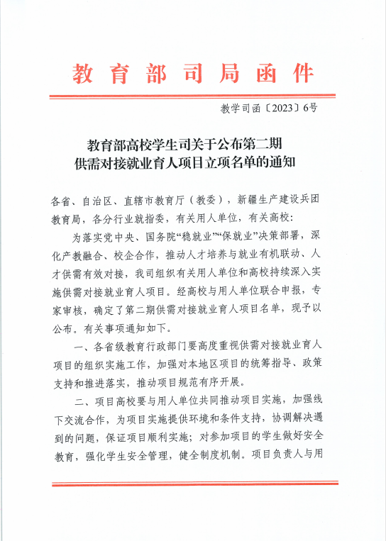 本网讯(通讯员 廖翔 )近日,教育部发布了高校学生司关于公布第二期供需对接就业育人项目立项名单的通知(教学司函〔2023〕6号),我院成功获批立项7项,其中定向永利集团培训项目1项,就业实习基地项目6项。