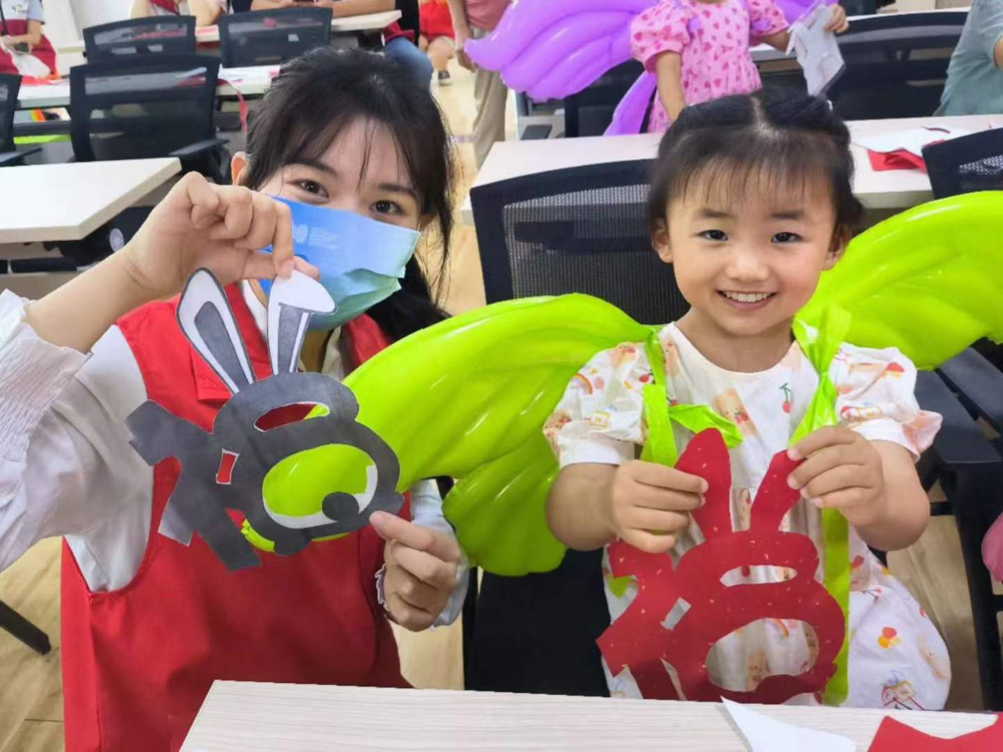 志愿者在剪纸课堂上提问时,小朋友们踊跃回答,表现出对剪纸文化极大的兴趣,志愿者们给所有小朋友们准备了学习用品和小翅膀作为纪念品,鼓励小朋友们更加热爱中国传统文化,学习中国传统技艺。