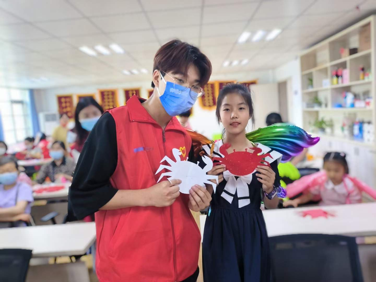 商学院“五色商行”志愿服务队的志愿者们在刘茜老师、张瑾老师和鲜于开悦老师的带领下,联合清江社区开启了“欢度六一 花样剪纸”小课堂。