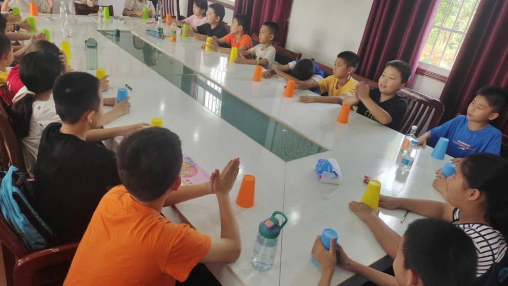 志愿者唐诗苗为孩子们带来了一堂《杯舞飞扬》的趣味音律课。随着美妙的音乐,师生们利用手中的杯子,通过集体的配合,演奏出一段非常美妙的音乐。小朋友们变花样“玩”塑料杯,翻、传、扣、拍....让人眼花缭乱。“杯子舞”独具特色,没有特定的形式,它更像是一种创意,让小朋友们在轻松愉快的节奏中发现音乐之美。