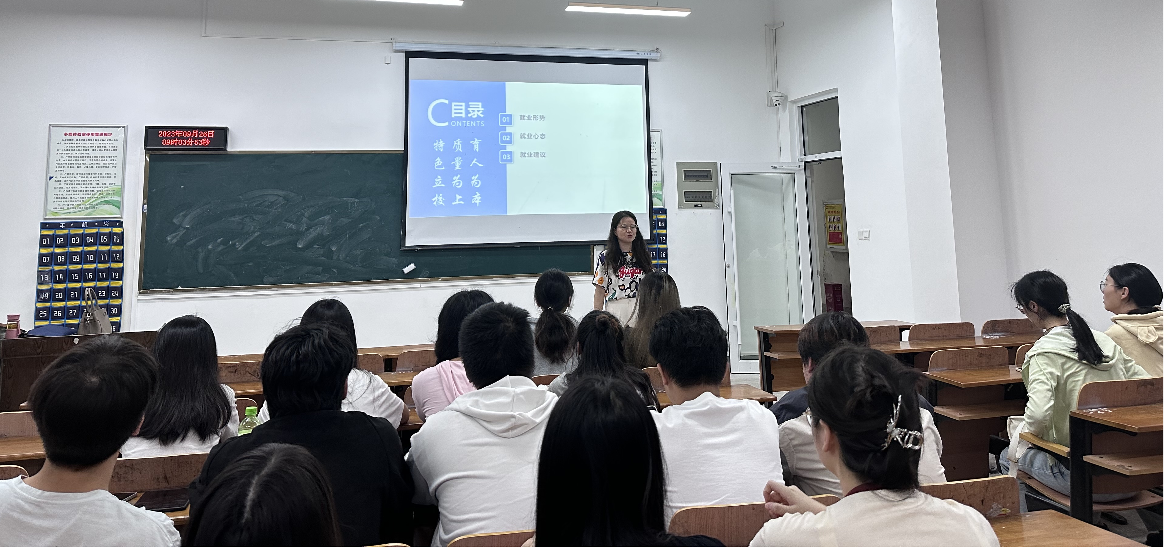 最后,毕业班辅导员王思琪强调了就业信息摸排统计表的重要性,鼓励还没有就业想法的同学早点做好规划和打算,提醒各位毕业生在毕业年级抓住机遇,勇敢迈步,在这个"金九银十"的就业战场上抢占先机!