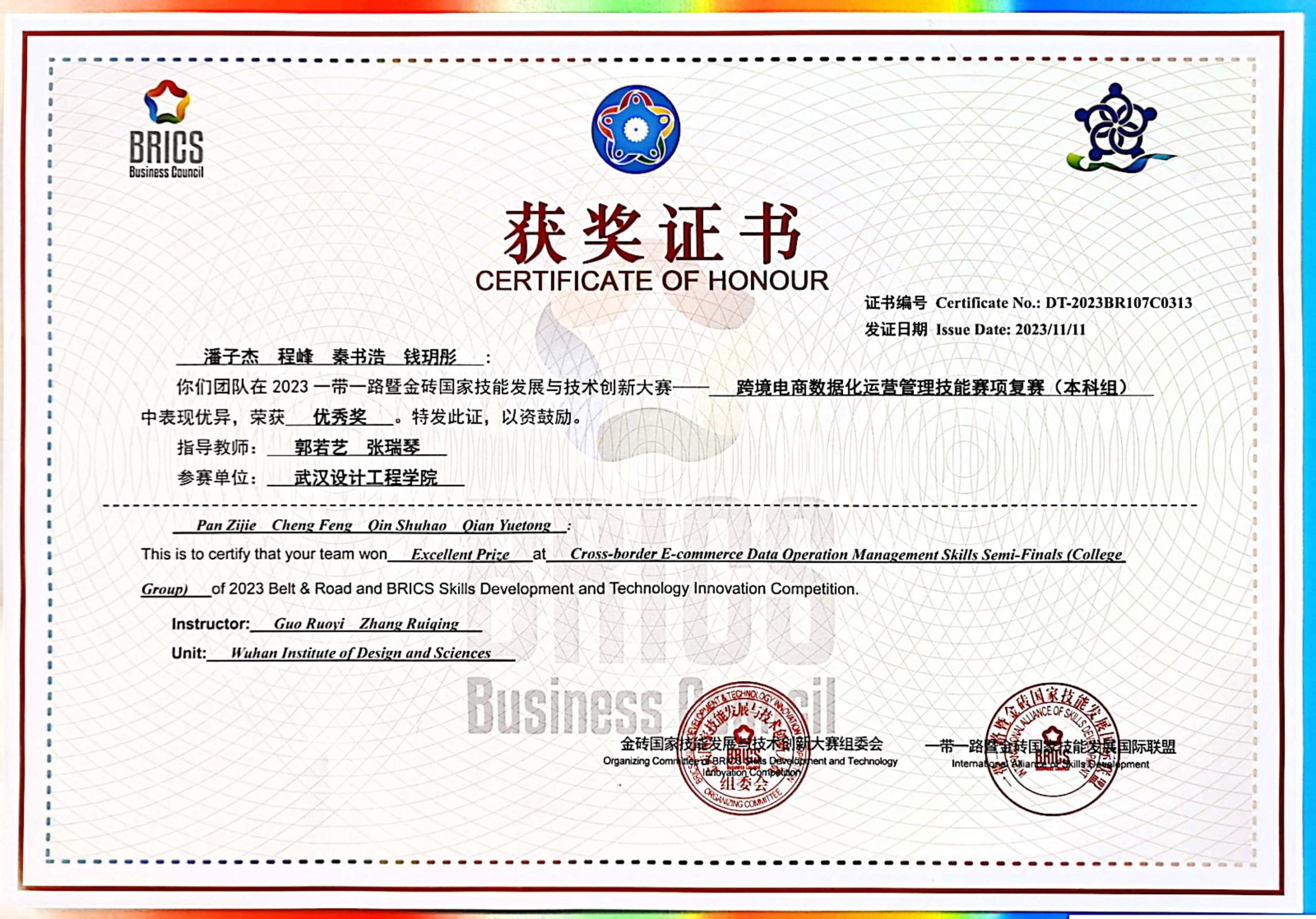 本网讯(通讯员 潘子杰)10月16日,商学院学生在2023一带一路暨金砖国家技能发展与技术创新大赛——跨境电商数据化运营管理技能赛项中,荣获二等奖、优秀奖各一项。商学院共组织五支队伍参赛,经过前期理论赛选拔和初赛淘汰,共有两支队伍进入复赛,并从数百支队伍中脱颖而出,荣获二等奖一项,优秀奖一项。