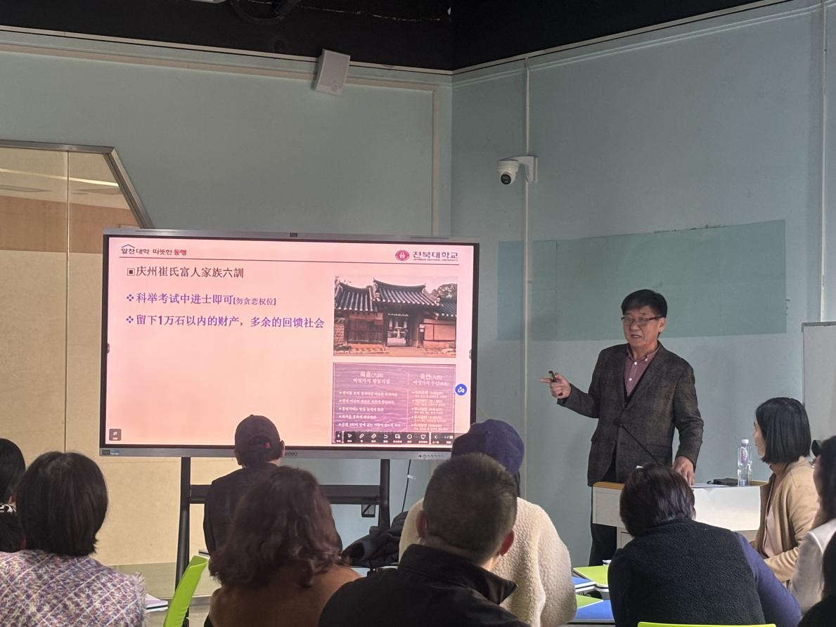 讲座过程中,崔栢烈教授讲授了CSR(Corporate Social Responsibility)企业社会责任;CSV(Creating Shared Value)创造共享价值; ESG(Environmental, Social, Governance)环保、社会责任、治理三种形态下企业主体的社会效应。他从韩国庆州崔氏富人家族六训的文化传承为切入点,结合中国古代文学家范仲淹“先天下之忧而忧,后天下之乐而乐”的家国理念,引出了企业国际化发展战略中必须承担的社会责任。他重点介绍了中国和韩国代表性跨国企业如华为、海尔、三星集团等在社会责任、创造共享价值、环保和改善组织结构等四个方面的比较及联系,分享了中国优秀传统文化在韩国的传播和影响等情况。