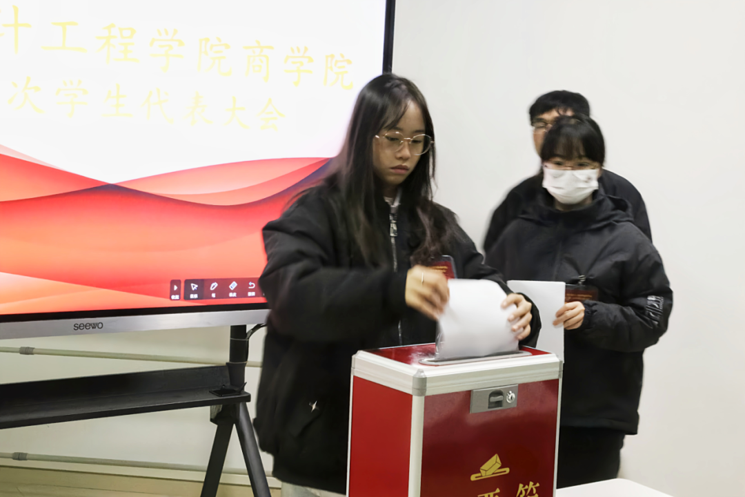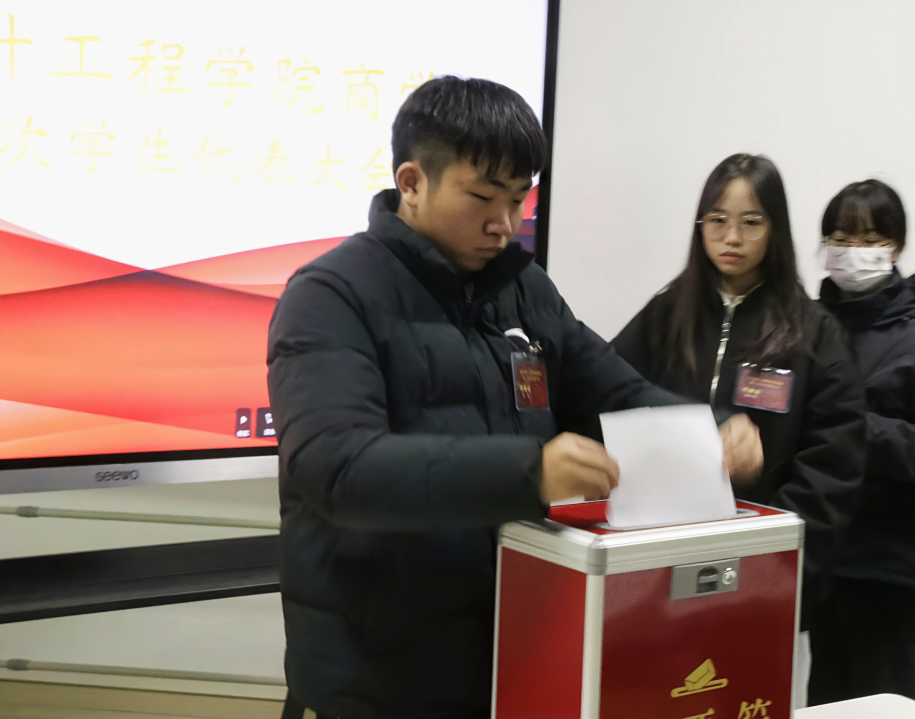 全体代表认证听取并审议学生会工作报告,通过差额选举产生新一届商学院学生会主席团成员。