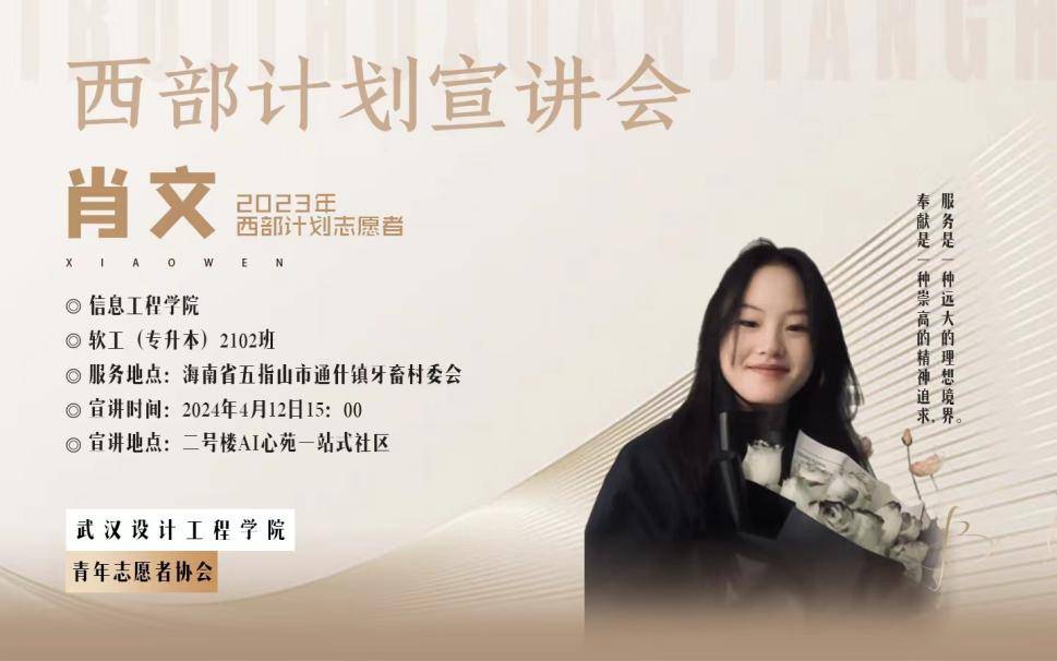 为进一步帮助学生们厘清西部计划志愿服务的实际情况,校团委还邀请了信息工程学院2023届毕业生、西部计划赴海南省志愿者肖文,为同学们做经验分享。肖文从乡村振兴、党建服务、志愿服务三个方面介绍了自己的工作内容。也从饮食、工作环境等方面为大家展现了服务地的美。最后她分享了自己过去一年的工作感受,“回首这一年,我深感自己的成长和变化。我变得更加成熟、自信和坚强。我相信,这段经历将会成为我人生中宝贵的财富。”她也号召同学们积极投身西部计划,成为一名光荣的志愿者。