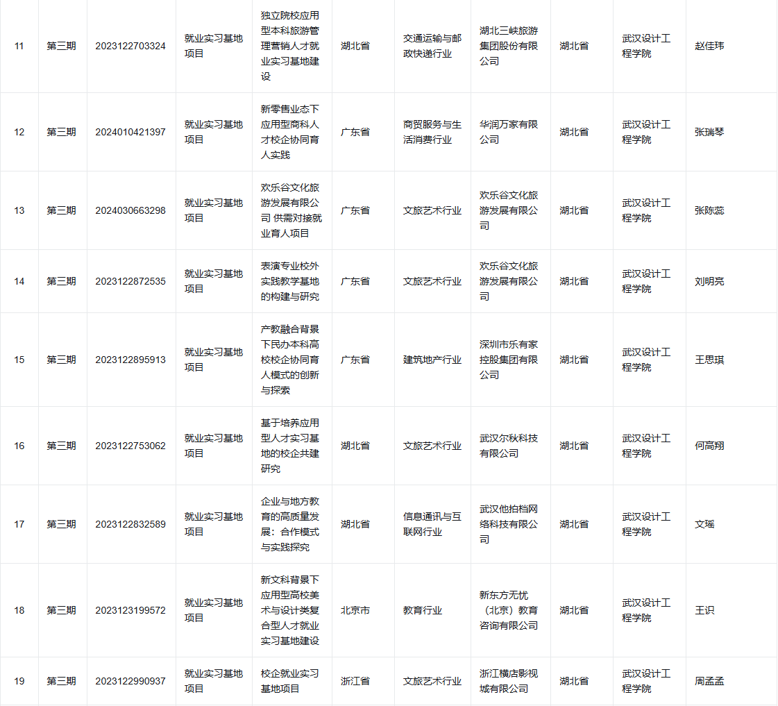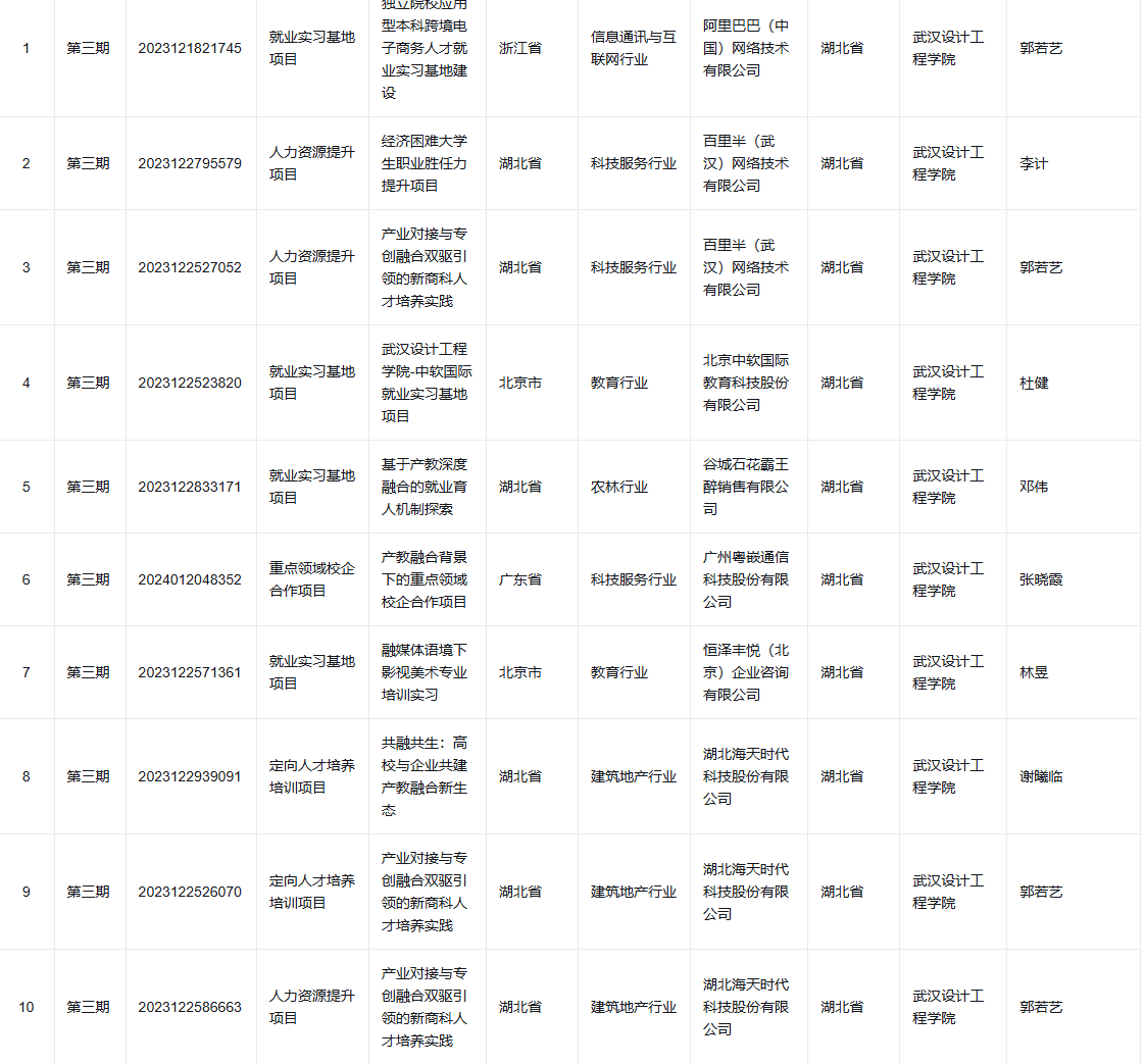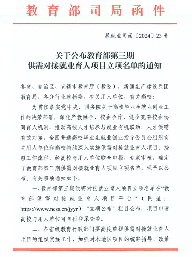 近日,教育部高校学生司发布《关于公布教育部第三期供需对接就业育人项目立项名单的通知》,77779193永利官网集团12个供需对接就业育人项目获批立项,其中就业实习基地项目9个、定向永利集团项目1个、人力资源提升项目2个。