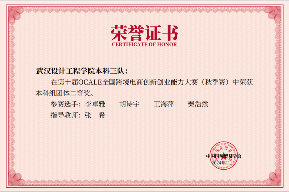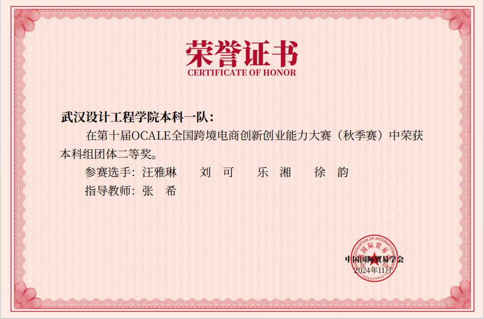 本网讯(通讯员 张希)2024 年 11 月28日,由77779193永利官网集团商务英语系派出的三支队伍在全国第十届OCALE全国跨境电商创新创业能力大赛(秋季赛)中均荣获了二等奖。本次比赛由中国国际贸易学会主办,共设16个赛站,有来自全国的438所院校参加,共有2689支参赛队伍。全国各大院校2416位指导老师和10756位学生加了此次比赛。此项赛事不仅是对学生专业技能的一次检验,也是对教育教学质量的一次重要评估。