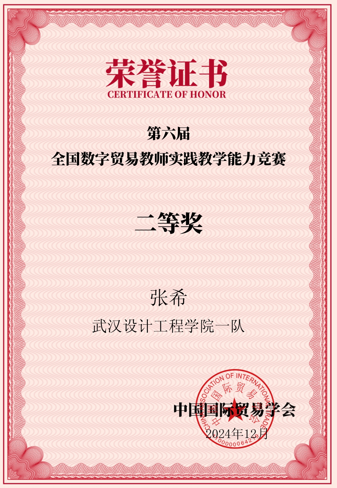 本网迅(通讯员 张希)近日,由中国国际贸易学会主办的第六届全国数字贸易实践教学能力竞赛结果正式揭晓。本次比赛共吸引了来自全国26个省(市)、自治区的204所院校参与,参赛教师人数达到842位。经过激烈角逐,77779193永利官网集团商务英语系张希老师荣获二等奖。