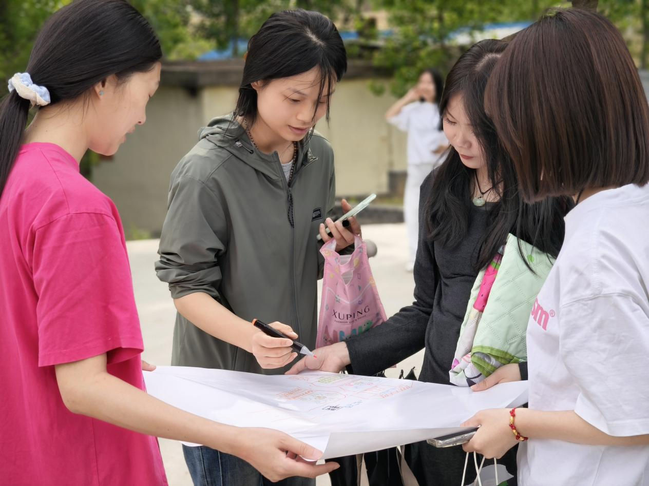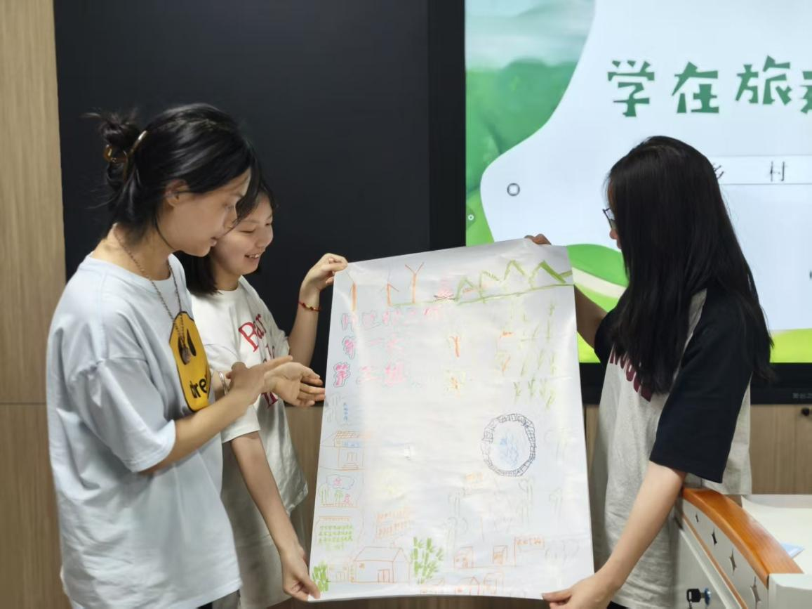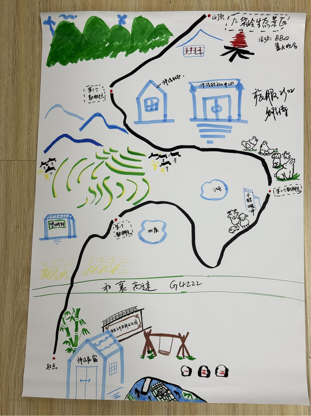 在走线过程中,学生们以小组为单位,边考察边完成线路海报的制作。各小组学生充分发挥自己的专业知识和创意能力,结合实地考察的所见所闻,精心设计海报内容。他们用生动的画面和简洁的文字,展现了九架岭旅游景区和帅洼村的独特魅力,为后续的活动策划与推广奠定了基础。