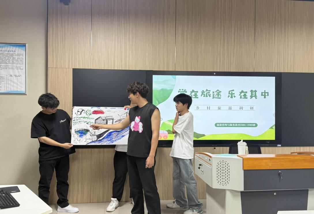 返校后,学生们以小组为单位对制作的海报进行了展示。在展示过程中,各小组学生积极分享自己的创作思路和调研心得,互相学习、互相借鉴。根据实践安排,学生们还将在后续完成帅洼村与九架岭旅游景区相应的活动策划与推广方案等作业。通过这些作业,学生们将进一步巩固和运用所学知识,提高自己的实践能力和创新能力。