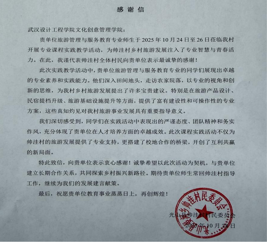 实践活动结束后,帅洼村村委会专门撰写并寄送了感谢信。信中对永利集团师生的到来表示诚挚感谢,称赞师生们带着专业知识与务实作风,通过实地调研、产品设计、民意收集等实际行动,为村庄文旅发展提供了新思路、新方案,切实助力乡村振兴,期待未来能继续深化校村合作,携手共创帅洼村旅游发展新局面。