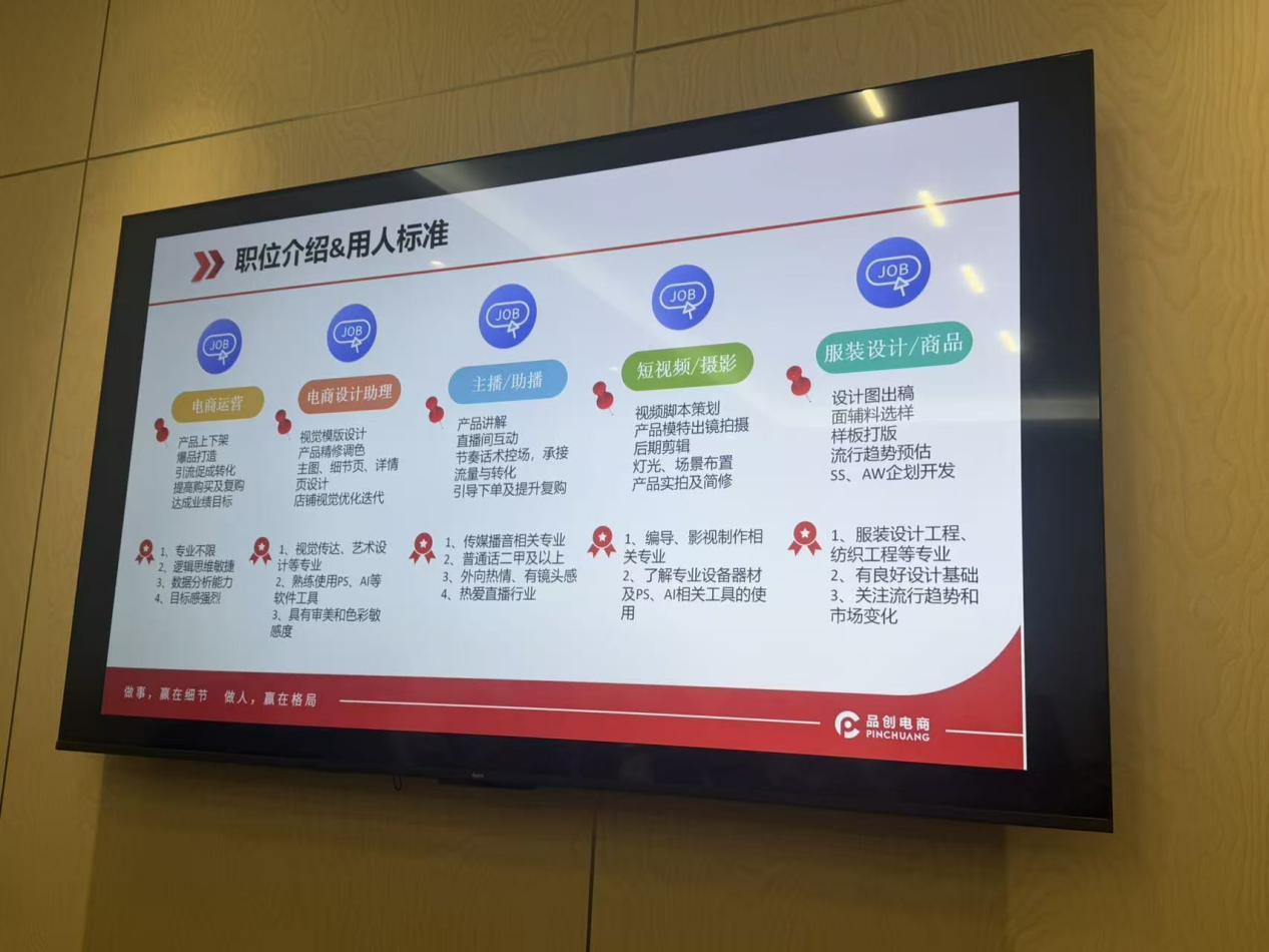 见习尾声,一场干货满满的座谈会在企业会议室举行。品创电商人力发展经理陈玉曼围绕企业文化、优秀员工成长案例及行业人才需求趋势,与师生们展开深入交流。她结合企业实际,分享了一位从实习生成长为业务骨干的案例,鼓励同学们在校期间扎实学习、积极实践。同时,她特别指出:“当前电商行业最需要的是复合型人才,未来的从业者不仅要掌握数据分析、营销策划、客户管理等技能,还需具备跨界思维和快速适应市场的能力。”现场展示的服装设计、商品管理、短视频摄影、主播助播、电商设计助理等岗位的用人标准,也为同学们指明了学习与发展的方向。