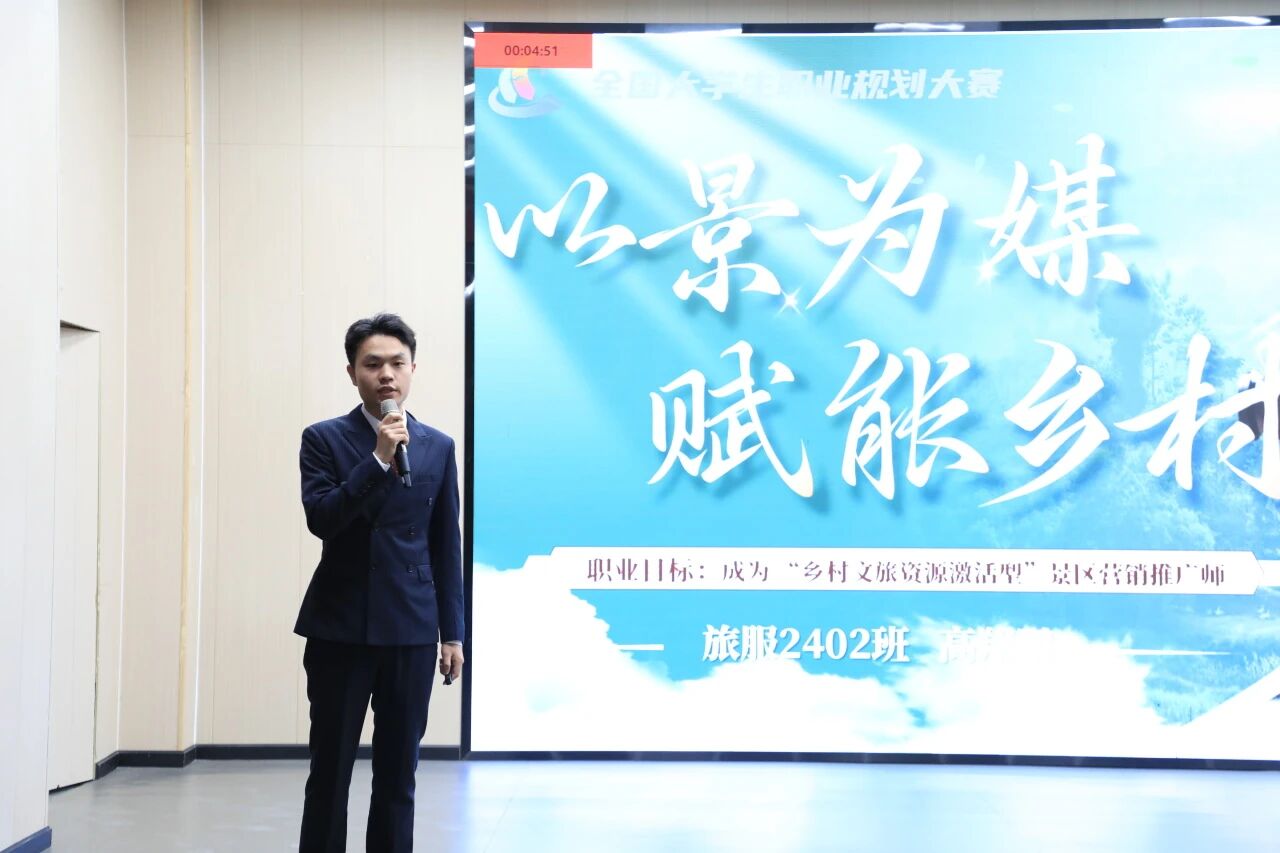 在成长赛道的角逐中,旅游管理与服务专业的高翔鹏同学凭借其系统全面的职业规划、扎实的实践积累与精彩的现场陈述,荣获校级金奖。他立足于专业所学,立志成为一名 “乡村文旅资源激活型”景区营销推广师 ,其规划深刻体现了对乡村文化价值的挖掘与旅游产业振兴的深刻思考,赢得了评委的高度认可。
