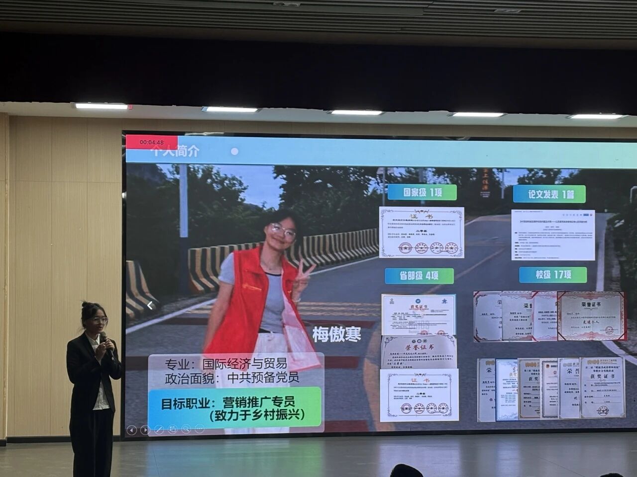在竞争激烈的就业赛道中,我院学子同样锋芒毕露。国际经济与贸易专业的梅傲寒同学以清晰的职业目标和扎实的路径规划,荣获校级银奖。她将专业知识融入进乡村振兴发展战略中,明确致力于成为一名深耕乡村振兴领域的营销专员,展现了新时代青年的责任与担当。商务英语专业的覃俊杰同学则凭借其在影视传媒领域清晰的创业实践与市场分析斩获校级铜奖,其跨学科融合的创新能力与对行业趋势的敏锐把握,给人留下深刻印象。