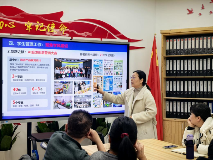随后,经贸与管理系主任郭若艺、商务英语系主任李卉琼、文化与旅游系主任刘昊昕分别就各系2025年度工作情况进行汇报。各系围绕年度重点工作成果、典型经验与特色亮点、存在问题与改进措施以及2026年度工作计划等方面作了详细阐述,展示了各系在专业建设、教学改革、永利集团等方面的积极探索与显著成效。