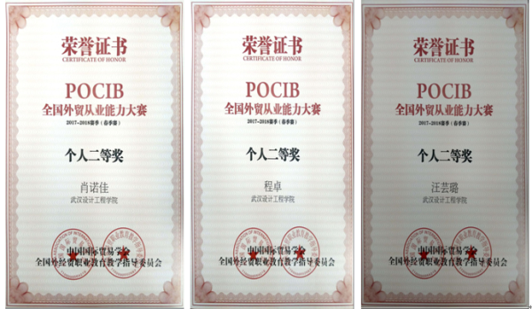 本网讯(通讯员 刘昊昕、陈丹丹) 在近日结束的2018年第七届POCIB全国大学生外贸从业能力大赛春季赛中,我校商学院学子成绩喜人,刘昊昕、郭若艺、陈丹丹、张杰四位老师指导的2015级国际经济与贸易、商务英语专业的学生分别获得了全国团体二等奖和三等奖,其中肖诺佳等3名同学获个人二等奖、邹可等9位同学获个人三等奖。