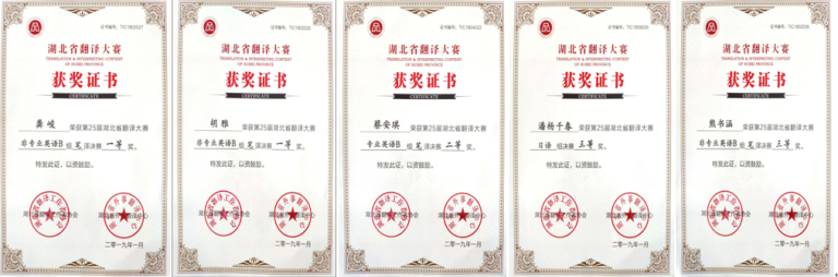 本网讯(通讯员 赵 丹)春染大地、生机勃发。近日,湖北省第二十五届外语翻译大赛结果揭晓,我校商学院2015-2018级商务英语专业学生胡雅、龚峻、蔡安琪、熊书涵和潘杨千春分别荣获非专业英语B组笔译决赛一等奖、专业英语B组笔译决赛二等奖、非专业英语B组笔译决赛三等奖和日语笔译决赛三等奖。指导教师张希和黄书君获得非专业英语B组笔译决赛一等奖优秀指导讲师奖。