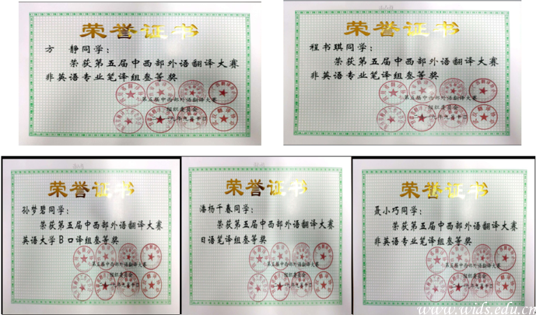 本网讯(通讯员 李卉琼)近日,第五届中西部外语翻译大赛成绩揭晓,我校2016-2018级学生在大赛中取得了优异的成绩。其中,我校2016级商务英语专业学生龚峻、程书琪、方静等同学分别获得了二等奖和三等奖若干项。此次学生竞赛取得的优异成绩对我校商务英语和公共英语翻译教学研究的发展起到了建设性的作用。