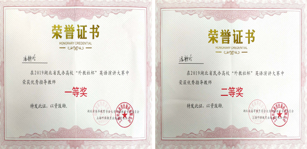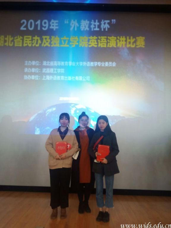 本网讯(通讯员 蔡安琪)近日,由湖北省高等教育学会大学外语教学专业委员会主办的2019年“外教社杯”‘讲好中国故事’英语演讲决赛在武昌理工学院隆重举行。我校2017级商务英语专业学生蔡安琪和 2018级数字媒体技术专业学生王雨彤在指导教师潘静玲的带队下,与来自20多所高校的参赛选手同台竞技,经过激烈的角逐,两位同学最终为学校赢得了荣誉,分别获得英语演讲竞赛专业组一等奖和非专业组二等奖的优异成绩,指导教师潘静玲获得了优秀指导教师一等奖和二等奖的荣誉。