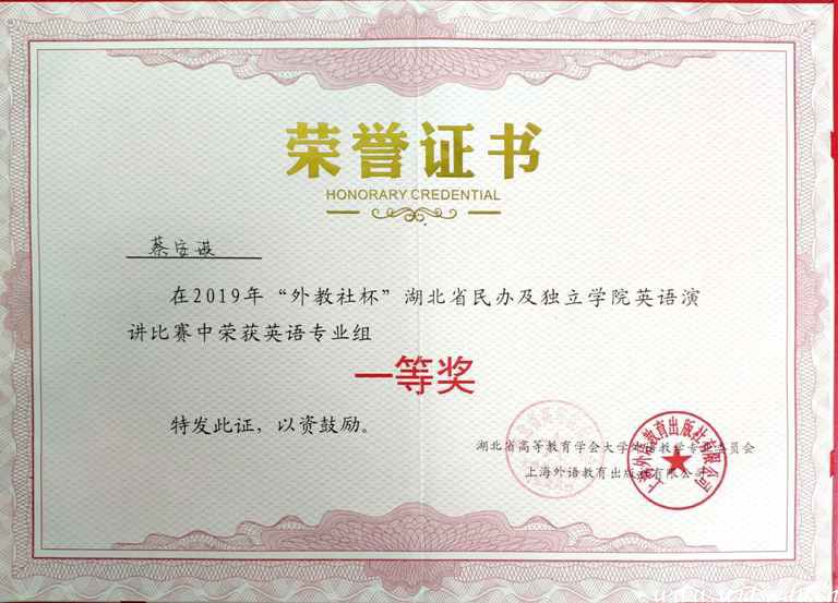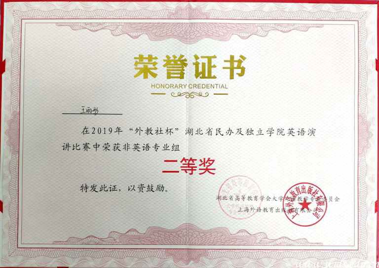 据悉,2019年“外教社杯”湖北省民办高校 “讲好中国故事”英语演讲竞赛按照专业设置,分英语专业组和非英语专业组两个赛区进行。决赛前,我校根据赛事流程,在全校范围内通过选题演讲和即兴演讲的方式择优选拨出蔡安琪和王雨彤两位同学代表我校参加英语专业组和非英语专业的决赛。