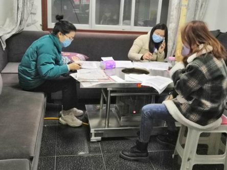商学院第一学生党支部李滢与志愿服务者电话询问买过药的居民有无发热咳嗽等情况
