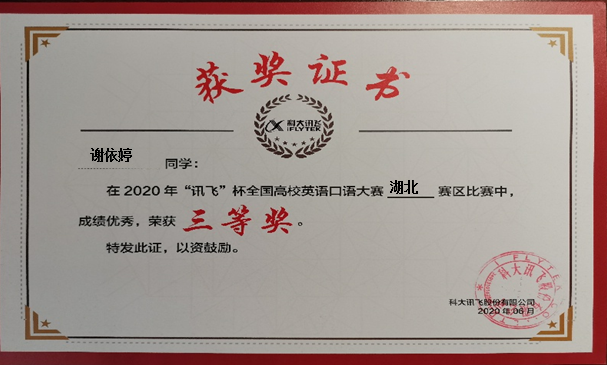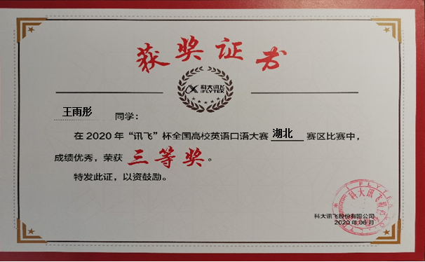 (通讯员 黄莹)2020年“讯飞杯”全国高校英语口语大赛湖北赛区比赛落下帷幕,商学 院大学英语教研室黄莹、陈伟老师分别指导的数字媒体技术1801班王雨彤、国际经济与贸易1901班谢依婷在比赛中脱颖而出,斩获湖北省赛区三等奖,系我校学生首次参加此赛事并获奖。