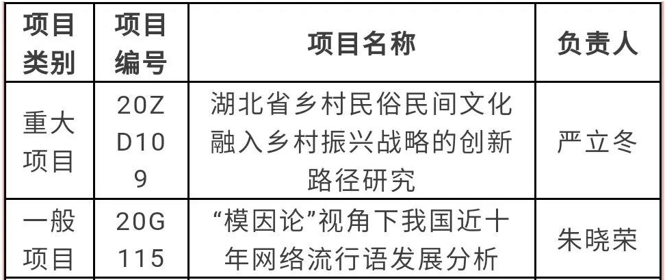 在获批项目中,我院院长严立冬教授申报的“湖北省乡村民俗民间文化融入乡村振兴战略的创新路径研究”(项目编号:20ZD109)获批重大项目,是近年来我校首次获批的省教育厅哲学社会科学研究重大项目,同类高校也仅2项。