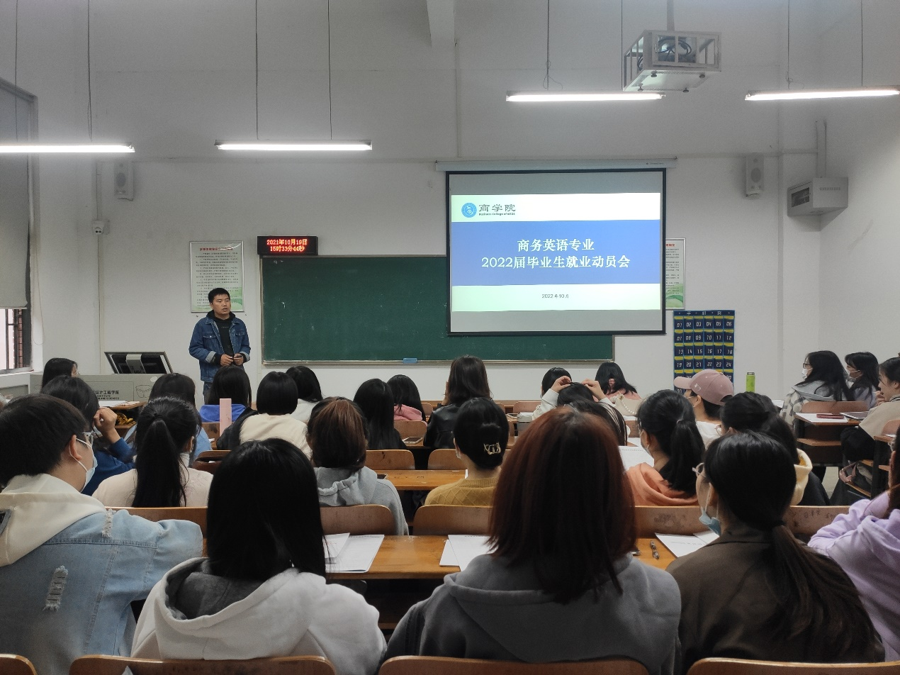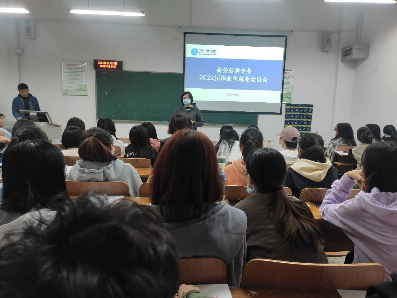 本网讯(通讯员 陈维)为进一步做好2022届毕业生就业工作,商学院于10月19日下午3:20在临湖轩A1039召开2022届商务英语专业毕业生就业动员会。会议由毕业班辅导员陈维主持,商务英语系系主任李卉琼、副主任张希老师和2022届商务英语专业全体毕业生参会。