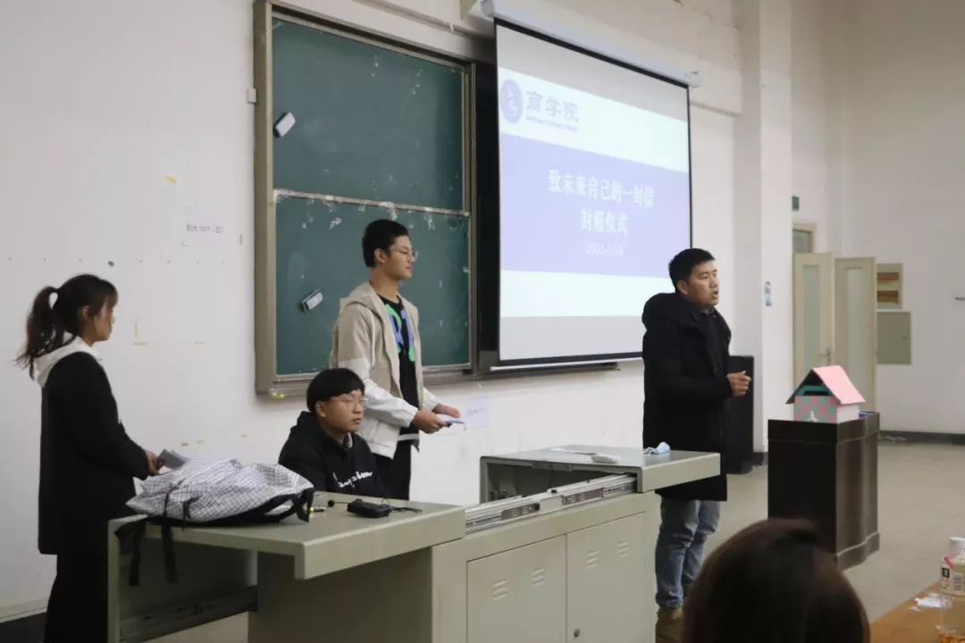 本网讯 (通讯员 曾巧 王凤娇 摄影 曹慧 夏瑞钦)2021年11月8日晚上7时,商学院于和光楼1019举行致未来自己的一封信封箱仪式。出席本次活动的有商学院2021级辅导员陈维老师、肖霞老师及各新生班级班助。本次活动目的在于希望大家对自己的大学四年有一个明确清晰的规划并在日后通过自己的行动去实现它。