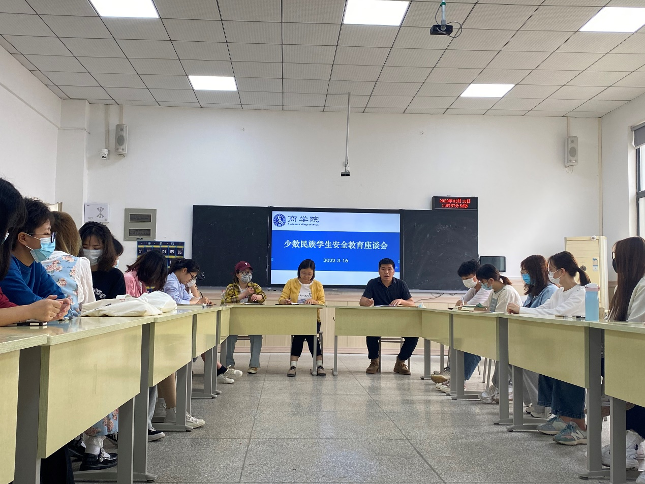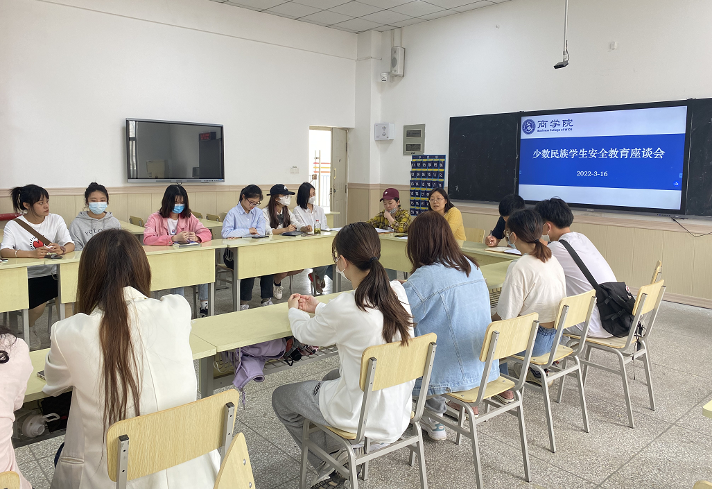 本网讯(通讯员 陈维)3月16日中午,商学院在临湖轩A5029召开少数民族学生安全教育座谈会。商学院党总支书记、统战委员胡紫玲、全体辅导员以及27名少数民族学生代表参加了座谈会。座谈会由辅导员陈维主持。