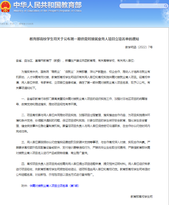 本网讯(通讯员 廖翔 )近日,教育部发布了高校学生司关于公布第一期供需对接就业育人项目立项名单的通知(教学司函〔2022〕7号),我院成功获批立项4项(学校共获批5项)。