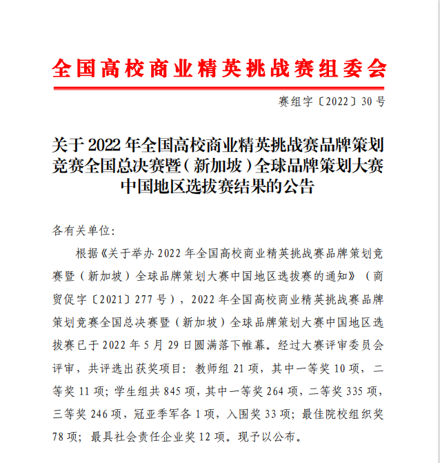 黄志斌老师赛后总结道:“首次参加该项国家级A级学科竞赛并取得两项一等奖的优异成绩,我院学子首次参加该项国家级A级学科竞赛并取得两项一等奖的优异成绩,要感谢学校高层对学科建设与发展给予的支持与投入,要感谢商学院领导的高度重视与持续关注,更要感谢学生在比赛过程中展示出的超强自主学习能力、锐意进取的创新意识与精诚协作的团队精神。此次比赛获奖更加坚定了商学院“十四五”期间大商科建设的总体规划目标——“文旅相融、商艺相通”,“知艺术、懂设计、通经管”的永利集团理念,以及“教、学、赛”一体化的教学体系。”